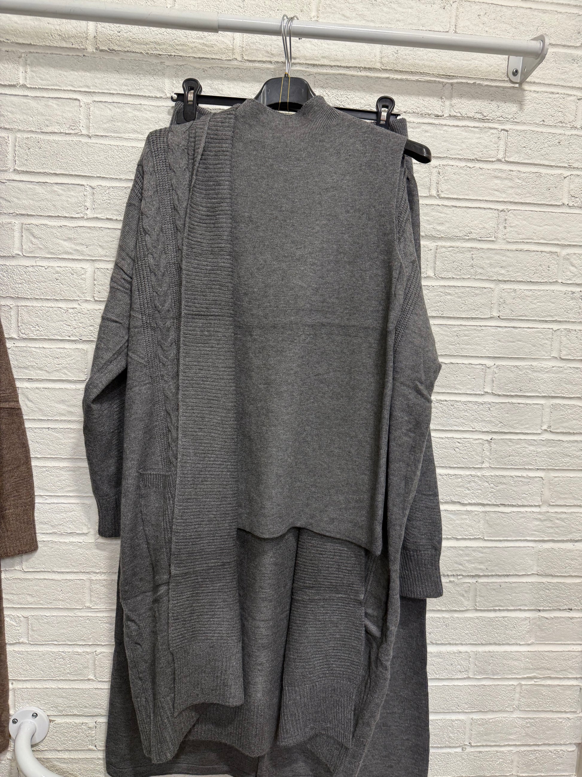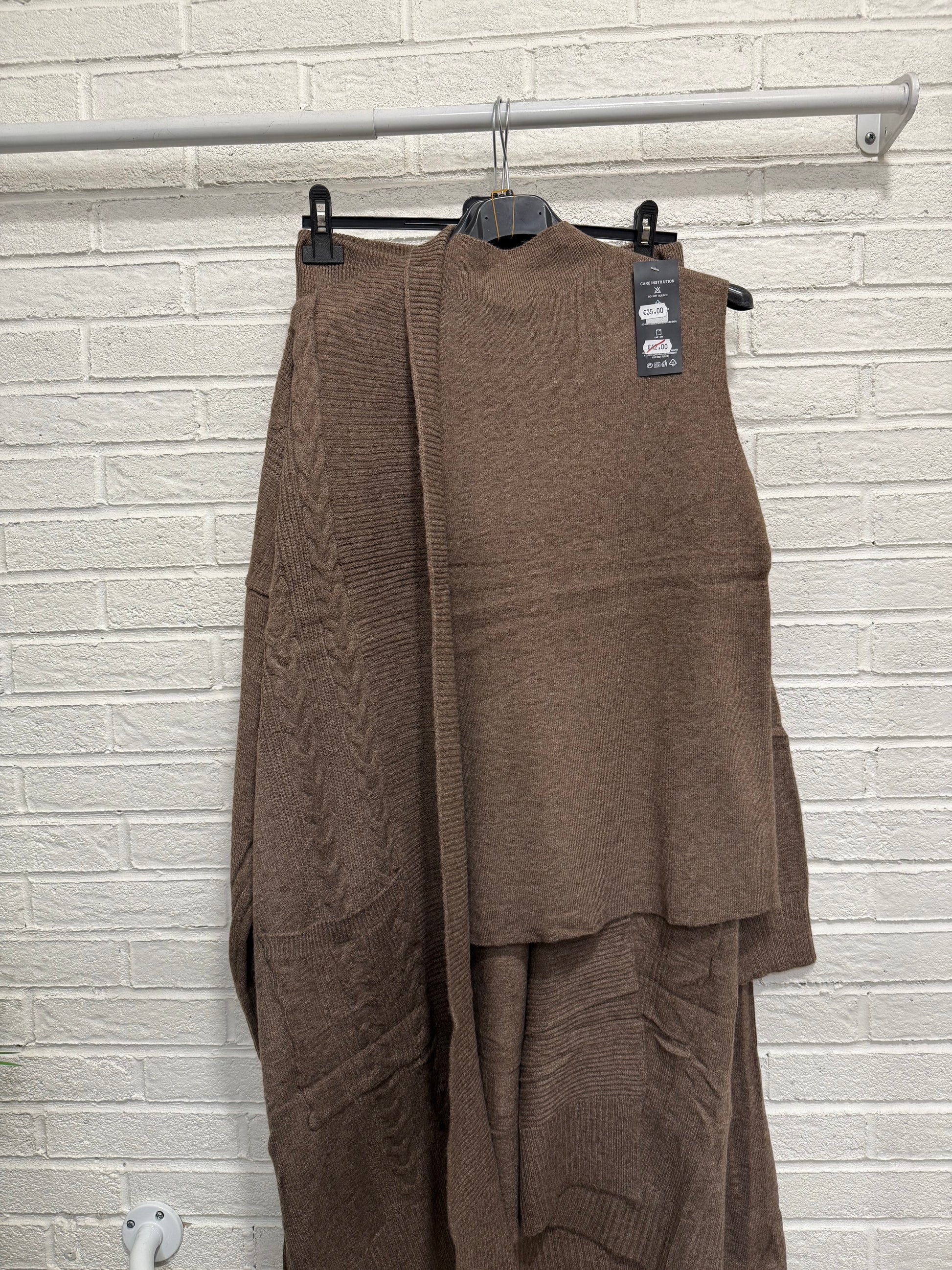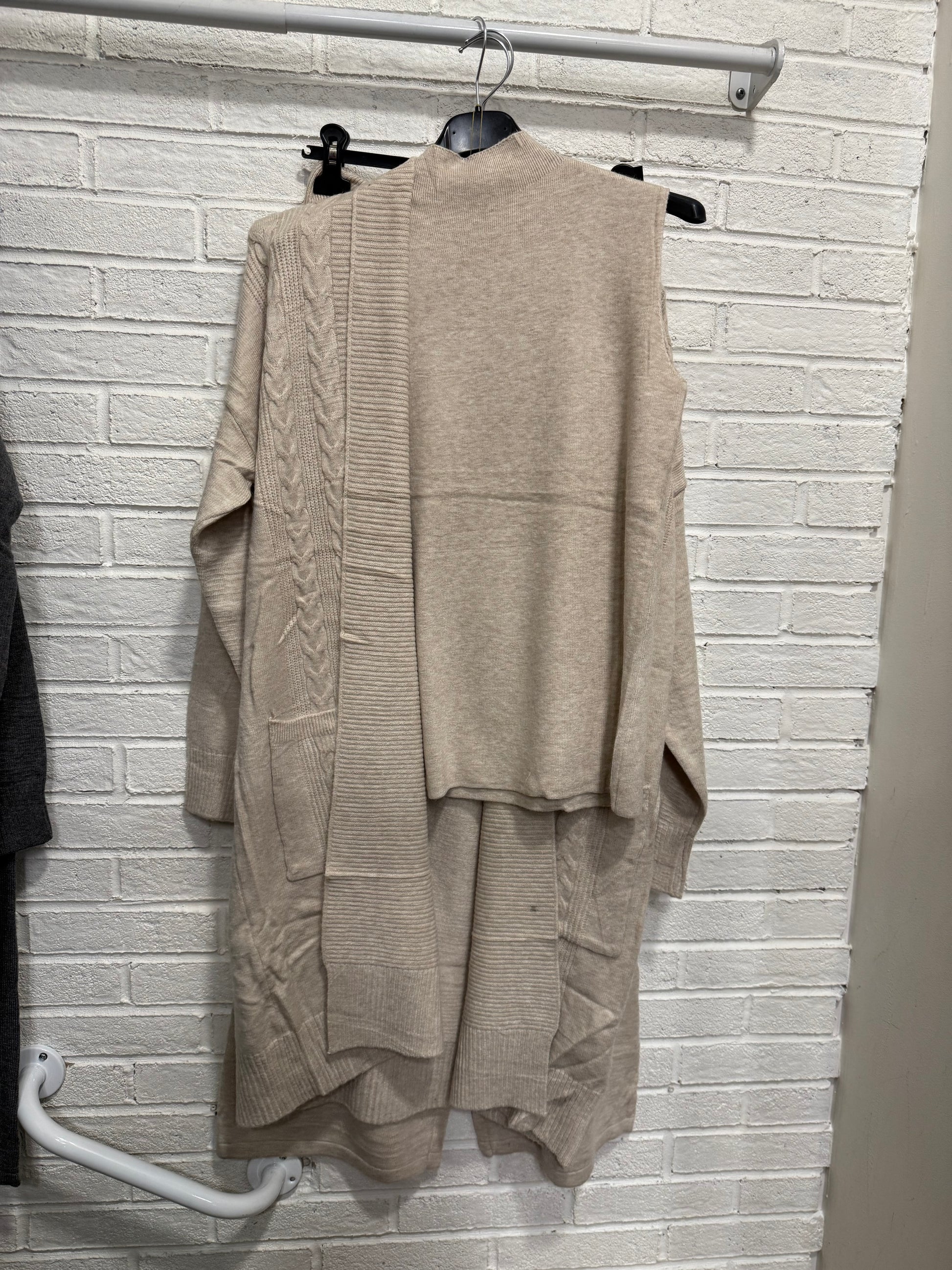 Très joli ensemble en trois pièces, taille unique quand vient au grand taille du S au quatre XLil se compose deux 60 % acrylique, 20 % laine, 10 % polyester 10 % elasthan Le modèle fait 1,70 m, taille 42