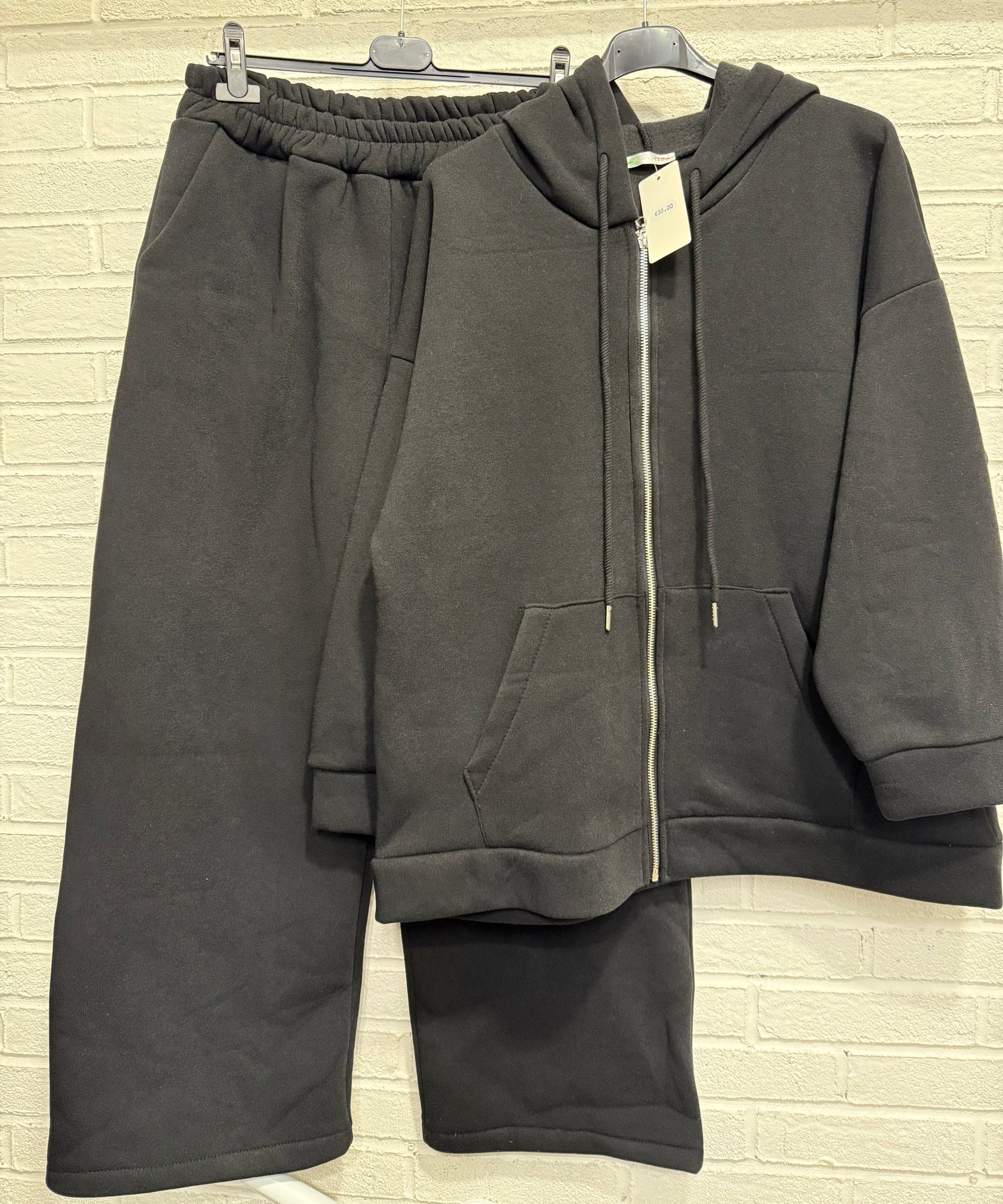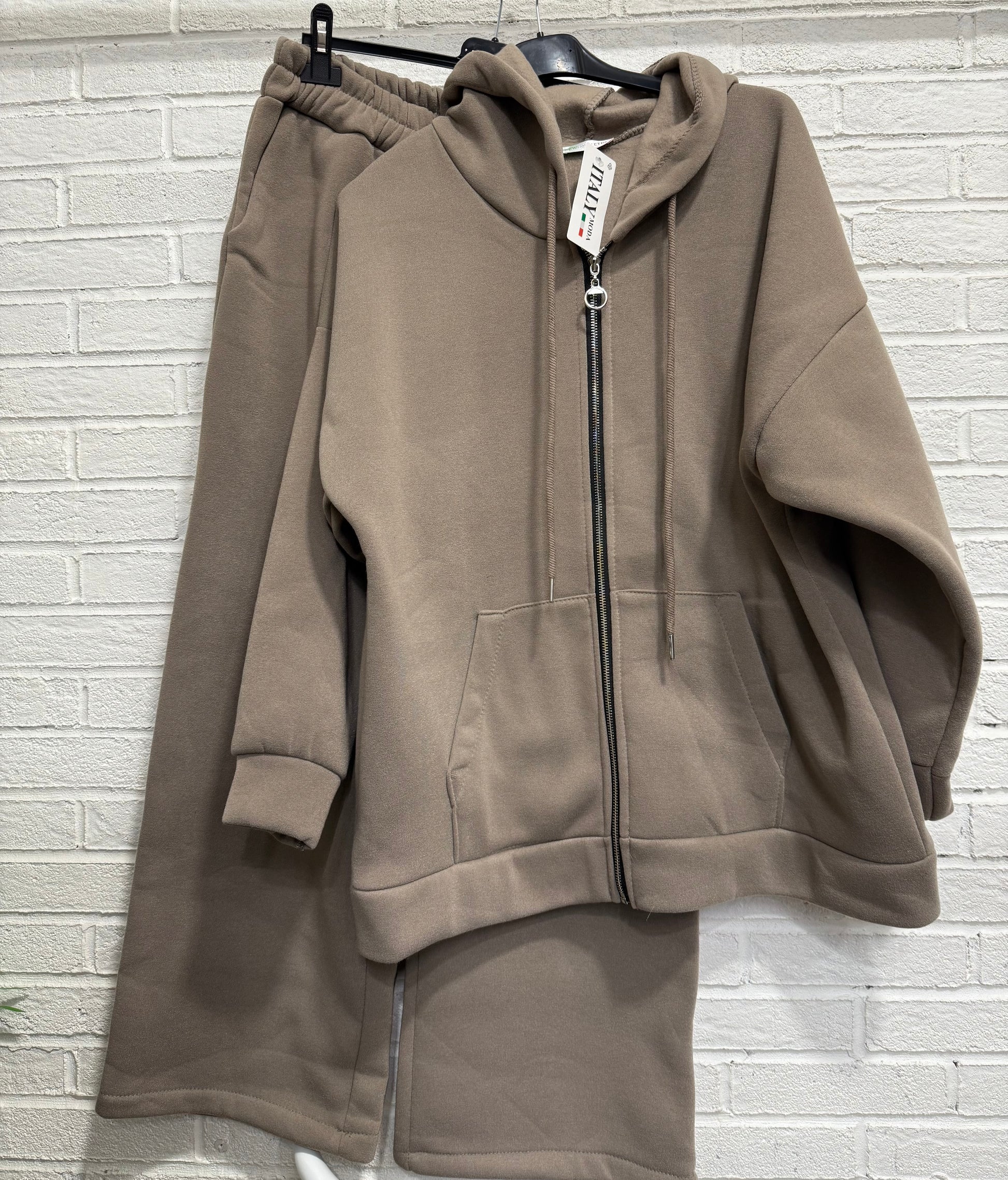 Ensemble décontracté et tendance avec un jogging et un pull à zip et à capuche avec des poches sur le côté pour le pull et pour le jogging. Composé de 95 % de coton et 5 % d’élasthane disponible en plusieurs coloris. Taille unique d’un 36 à 44