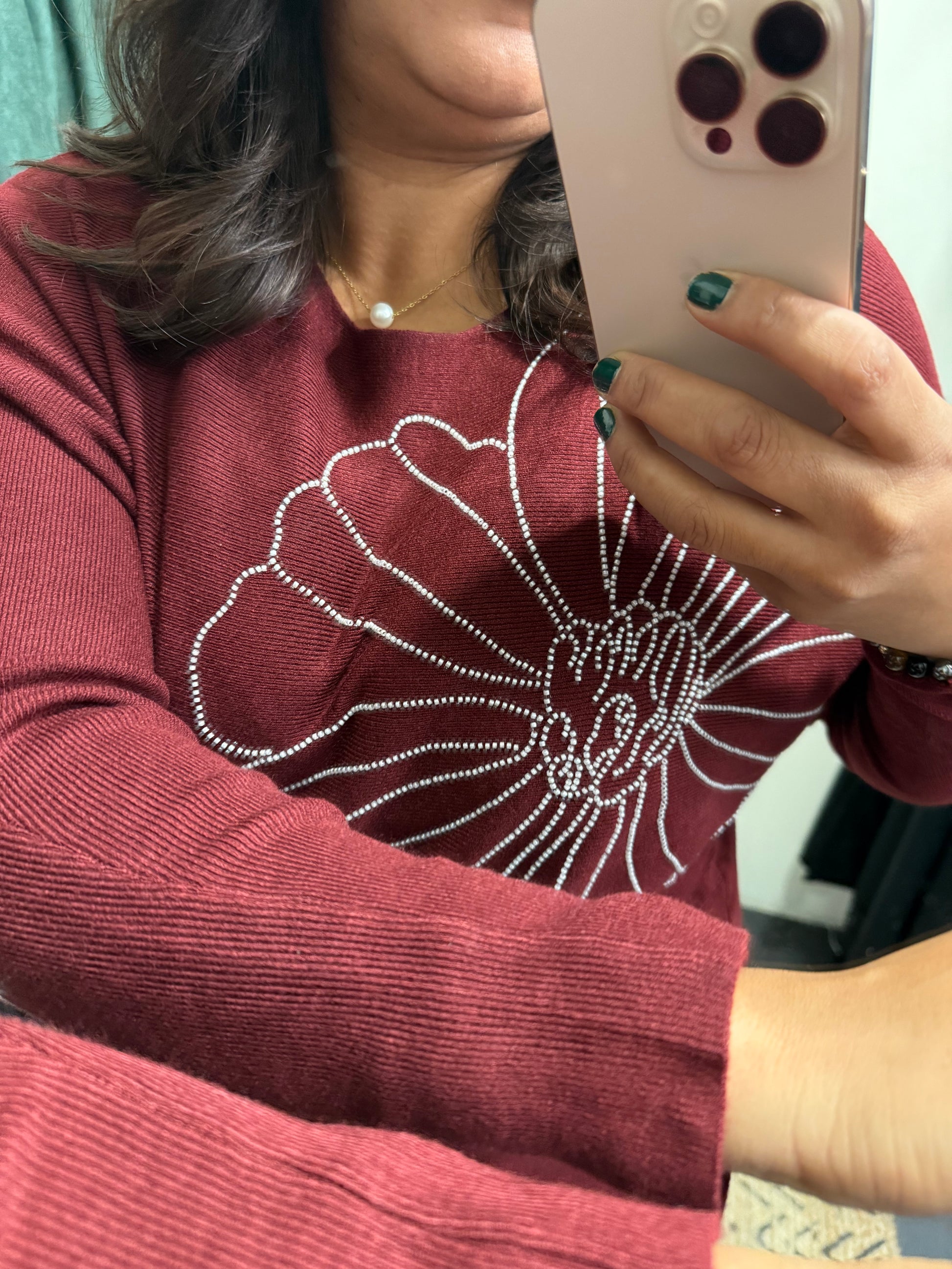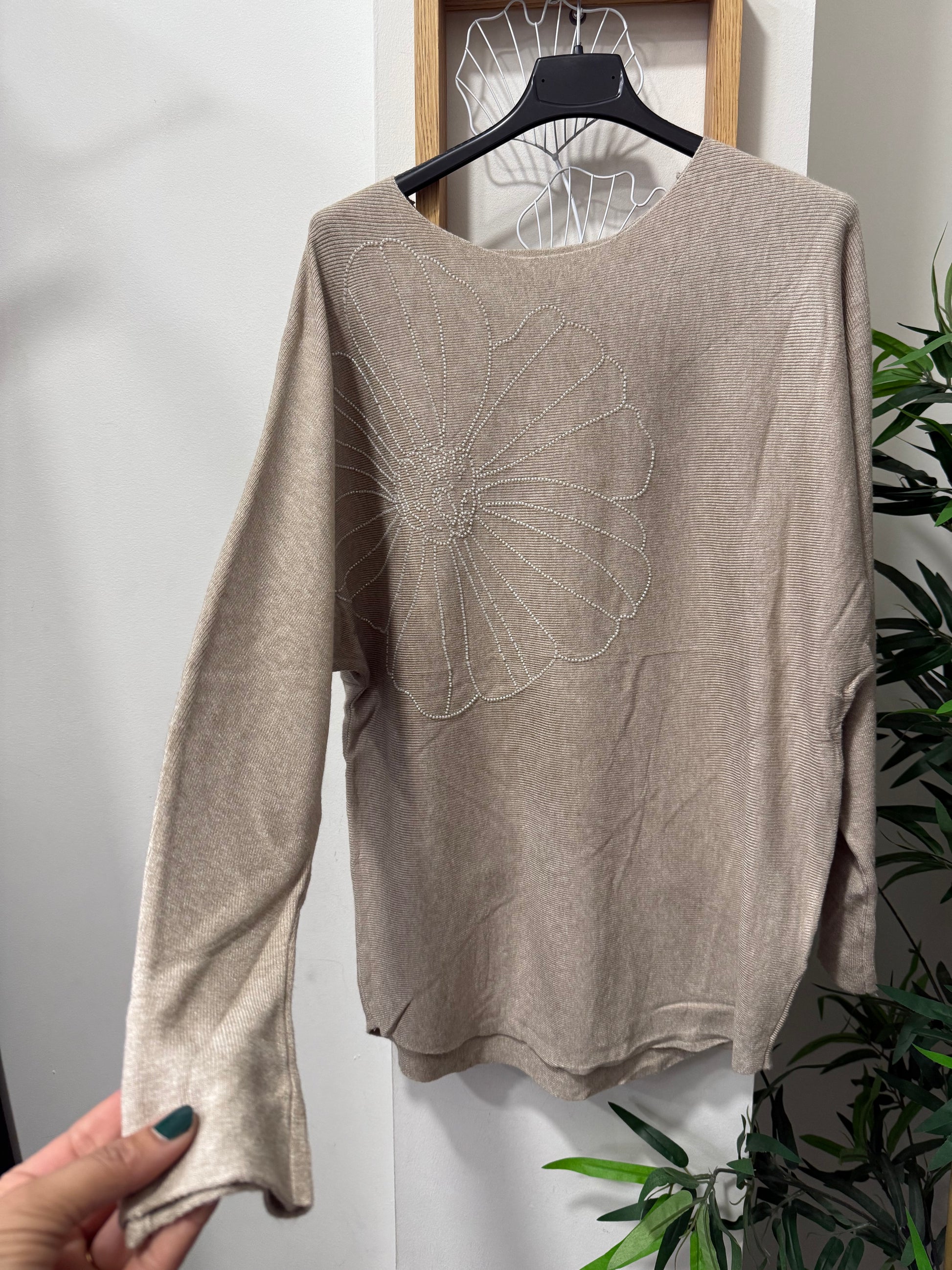 Très joli pull, taille unique existe en plusieurs couleurs. Unis avec une fleur à droite en strasse, il se compose de 65 % acrylique, 30 % viscose 5 % spend, Dex, le modèle fait 1,70 m, taille L.